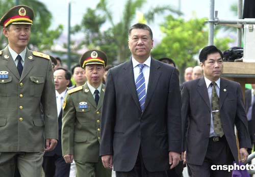 特首何厚鏵觀看軍事科目、文藝節(jié)目表演后,參觀了戰(zhàn)士們的生活、工作和學(xué)習(xí)環(huán)境,并向駐軍贈送軍樂樂器。