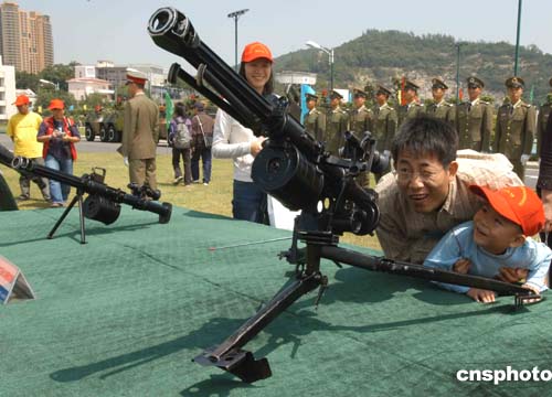 進(jìn)入營區(qū)參觀的市民最大興趣的是,觀看軍事科目表演和部隊(duì)武器裝備展示,他們紛紛在裝甲車前拍攝留念,對武器裝備更是愛不釋手。