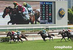2004年“國慶杯”賽馬比賽3日在香港沙田賽馬場舉行﹐比賽爭奪的緊張﹑激烈。作者:趙振清