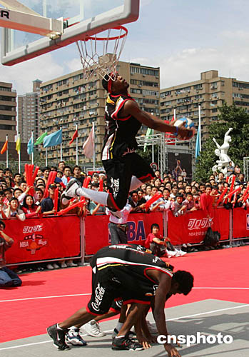 一批來自法國的灌籃高手在上!岸懔闼目煽诳蓸種BA嘉年華”開幕式上表演,吸引上;@球迷觀賞。