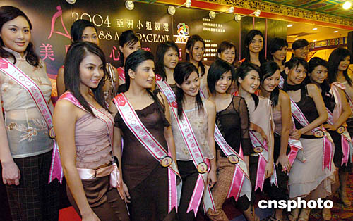 圖為選自香港的候選佳麗馮梓瑩出席亞姐發(fā)布會。