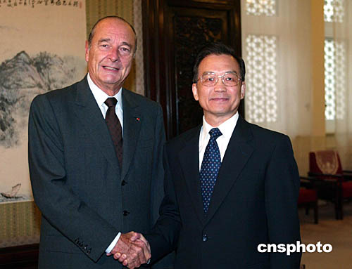 國(guó)務(wù)院總理溫家寶十月十日在北京會(huì)見(jiàn)法國(guó)總統(tǒng)希拉克。中新社記者:滿會(huì)喬