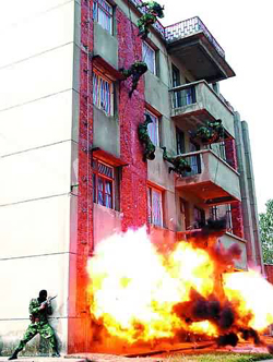 驚心動魄的反劫持人質(zhì)“戰(zhàn)斗”打響了!5名“恐怖分子”作案后,駕駛一輛面包車劫持3名“人質(zhì)”逃竄。特勤中隊接到上級命令后,立即兵分兩路,一路在各主要路口設(shè)障攔截,一路沿“歹徒”逃離方向?qū)嵤┳窊。在走投無路的情況下,“歹徒”劫持“人質(zhì)”竄到某單位一辦公樓。在雙方對峙不下時,根據(jù)上級指示,特勤中隊采取強行突擊。說時遲,那時快,一聲巨響后,戰(zhàn)士們空中突降,從窗口魚躍而入,隨著幾聲槍響,“歹徒”們死的死,傷的傷,全被制服,3名“人質(zhì)”安然無恙,演練場內(nèi)再次掌聲如潮……