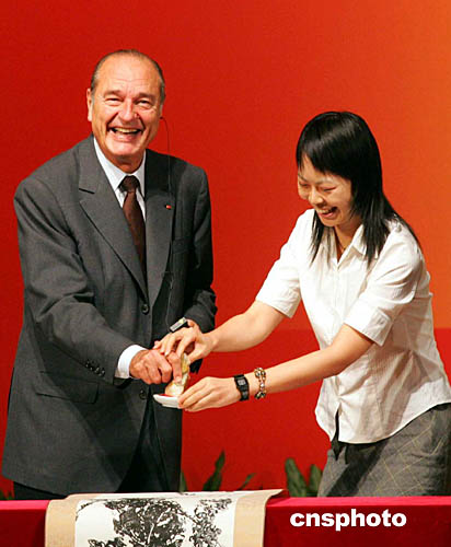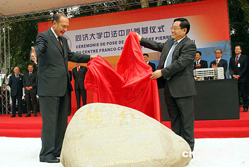 素有“中國情結(jié)”的法國總統(tǒng)希拉克今天一到上海就來到著名高等學(xué)府同濟(jì)大學(xué),向全中國青年滿懷感情地表達(dá)來自法國的友誼與共同接受新世紀(jì)挑戰(zhàn)的美好愿望,并接受了中國學(xué)子寓意中法友誼長存的禮物。