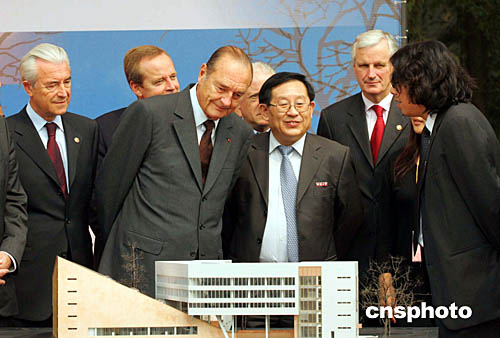 演講之前,希拉克出席了中法中心的奠基儀式。他一邊聽講解,一邊仔細(xì)觀看了即將破土動(dòng)工的中法中心模型。他在演講中說,很高興能夠參觀中法科技創(chuàng)新中心的建筑模型,并稱之為中法合作精神的重要體現(xiàn)。