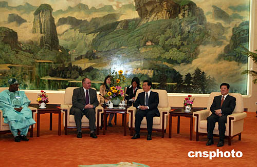 國家主席胡錦濤十月十一日在北京會(huì)見來華出席“經(jīng)濟(jì)全球化與工會(huì)國際論壇”的外國工會(huì)代表。全國人大常委會(huì)副委員長(zhǎng)、中華全國總工會(huì)主席王兆國也參加會(huì)見。中新社記者:滿會(huì)喬