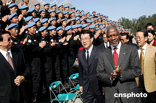 正在北京訪問的聯(lián)合國(guó)秘書長(zhǎng)安南,十月十二日參觀公安部維和中心。中新社記者:毛建軍