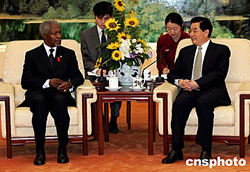 中新網(wǎng)10月12日電 據(jù)中國(guó)外交部網(wǎng)站消息,2004年10月12日下午,國(guó)家主席胡錦濤在人民大會(huì)堂會(huì)見了來華訪問的聯(lián)合國(guó)秘書長(zhǎng)科菲·安南。