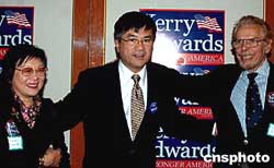 當(dāng)?shù)貢r間十月十三日,美國第一位華裔州長、華盛頓州州長駱家輝(中)前往紐約華埠,為民主黨總統(tǒng)候選人克里爭取亞裔選票。當(dāng)晚,克里和布什進(jìn)行了最后一場美國大選辯論。作者:趙海燕