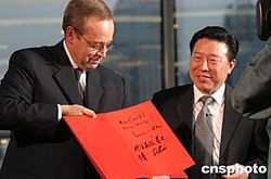 十月十四日,參加國(guó)際文化政策論壇第七屆文化部長(zhǎng)年會(huì)的法國(guó)文化部長(zhǎng)德瓦布萊先生和中國(guó)文化部長(zhǎng)孫家正在上海國(guó)際會(huì)議中心就中法共同舉辦文化年活動(dòng)的影響展開(kāi)專(zhuān)題討論。中新社記者:廖文靜