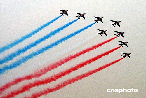 法國(guó)空軍“法蘭西巡邏兵”是當(dāng)今世界著名的五大特技飛行表演隊(duì)之一,與英國(guó)的“紅箭”、意大利的“三色箭”并稱為“歐洲三杰”。本次該飛行表演隊(duì)隨法國(guó)總統(tǒng)希拉克首次來(lái)華訪問,作為在中國(guó)舉辦的法國(guó)文化年重要活動(dòng)內(nèi)容之一,定在北京、武漢、香港和珠海四個(gè)城市進(jìn)行飛行表演。此前,飽受天氣困擾的“法蘭西巡邏兵”直至本月十一日才在北京進(jìn)行首演。