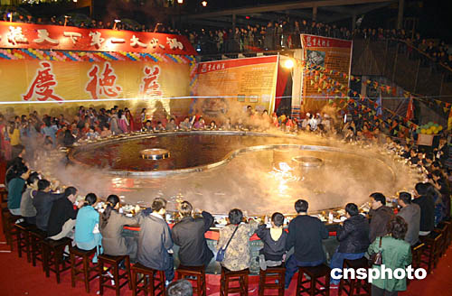 在有“天下第一大鍋”之稱的德莊大火鍋前,人頭攢動,熱鬧非凡,上千斤火鍋底料熬出的湯汁濃香撲鼻,讓人垂涎。重慶市人民政府副市長謝小軍在開鍋點(diǎn)火儀式上說,這天下第一大鍋有五十六個座位,象征著五十六個民族齊聚火鍋之都,品嘗這一山城美食。