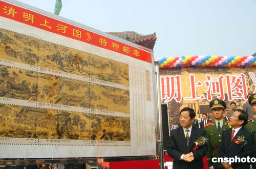 | 十月十八日,《清明上河圖》特種郵票首發(fā)儀式在河南開封清明上河園舉行!肚迕魃虾訄D》特種郵票是依據(jù)北京故宮博物院珍藏的中國(guó)北宋著名畫家張擇端的《清明上河圖》原作設(shè)計(jì)的。該郵票是中國(guó)郵票從一八七八年開始發(fā)行迄今為止最為精美的一套古代名畫郵票,也是中國(guó)郵票發(fā)行史上選題宏大、具有很高收藏價(jià)值的一套郵票。作者:何曉聰