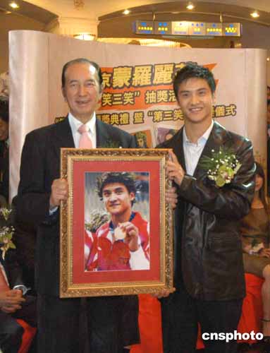 田亮向澳博行政總裁何鴻燊博士贈(zèng)送奧運(yùn)金牌照片留念。作者:梁永強(qiáng)