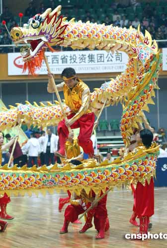 十月十九日,全國(guó)第五屆農(nóng)民運(yùn)動(dòng)會(huì)的舞龍規(guī)定套路決賽在江西省宜春市體育中心進(jìn)行,湖南代表隊(duì)?wèi){借精彩的表演奪取本屆舞龍比賽項(xiàng)目中的第一枚金牌。圖為湖南代表隊(duì)在比賽中。作者:盛佳鵬