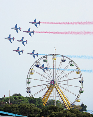 擔任特技表演的八架阿爾法戰(zhàn)機,在港島海面上空排列出菱形、雁行、箭形及十字形等不同隊型,并不斷做出空中翻跟斗、急轉(zhuǎn)彎、突然分散及對飛等被人形容為“空中芭蕾”的連串高難度花式表演動作。表演中飛機尾部噴灑出象征法國國旗的紅、白、藍三種彩色煙霧,在空中形成美麗的圖畫。約半個小時的精彩特技飛行引得香江觀眾陣陣歡呼和贊嘆。