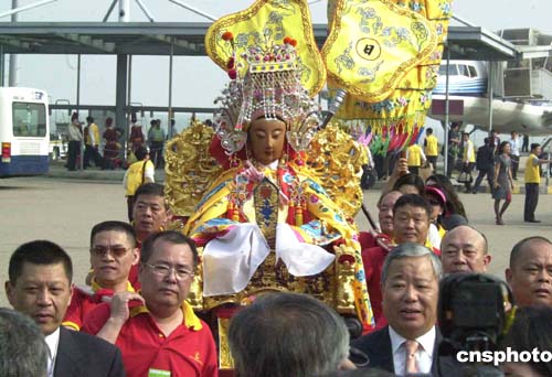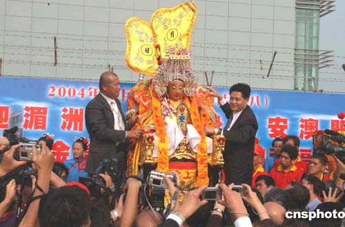 二十一日下午三時(shí),湄洲媽祖金身乘搭專機(jī)從福州飛抵澳門,澳門中華媽祖基金會(huì)在澳門國際機(jī)場舉行隆重的接駕儀式,澳門中華媽祖基金會(huì)副主席陳明金等為媽祖金身披上金披鳳。