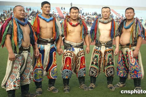 按蒙古族傳統(tǒng),摔跤手上身穿牛皮或帆布制成的“著德格”袖臂蓋背,邊沿鑲有銅釘或銀釘。腰系“來布爾”(即圍巾),下身穿肥大“班斯勒”(即摔跤褲),是用三十二尺或十六尺白布制作的專用摔跤褲,外套有花色的套褲,腳蹬蒙古靴或馬靴。頸套五色綢穗制成的“景嘎”,標(biāo)志著獲勝次數(shù),名次越多,彩條依次增加。