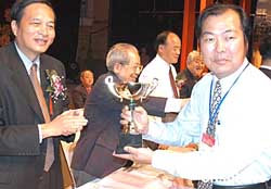 | 臺(tái)灣中華美食交流協(xié)會(huì)、馬祖餐飲協(xié)會(huì)、金門觀光訪問團(tuán),十月二十三日在第十四屆中國廚師節(jié)暨海峽兩岸美食節(jié)閉幕式上獲得組委會(huì)頒發(fā)的特別貢獻(xiàn)獎(jiǎng)。圖為原中國商務(wù)部部長胡平(圖中)、福州市市長練知軒(圖左一)等為有關(guān)獲獎(jiǎng)代表頒獎(jiǎng)。作者:劉可耕