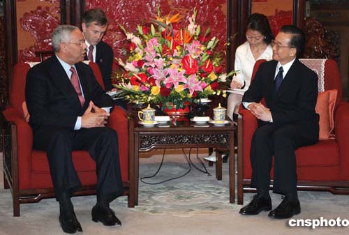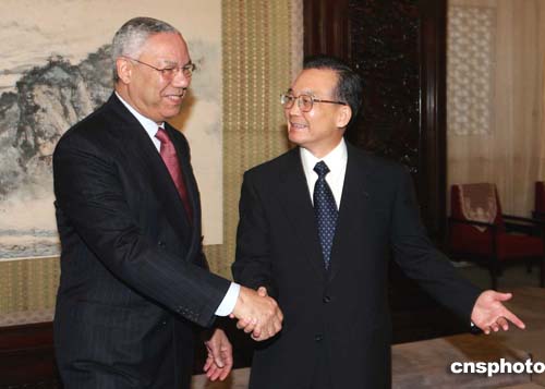 溫家寶會(huì)見鮑威爾 稱領(lǐng)導(dǎo)人會(huì)晤有助于雙邊關(guān)系