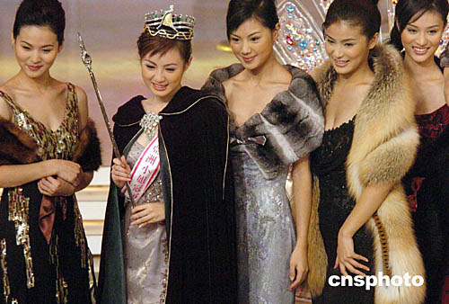 2004亞洲小姐競選總決賽,于十月二十四日晚在香港演藝學(xué)院舉行,來自杭州的佳麗呂晶晶奪得桂冠后,眾佳麗與呂晶晶拍照留念。中新社記者:錢興強(qiáng)