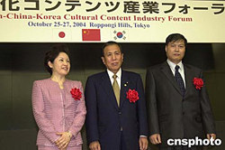 第三屆中日韓文化產(chǎn)業(yè)論壇二十五日在東京舉行。這個(gè)由三國(guó)主管官員和業(yè)界人士參加的新型論壇,是兩年前在中國(guó)上海創(chuàng)辦的。中國(guó)文化部副部長(zhǎng)孟曉駟(左)、日本經(jīng)濟(jì)產(chǎn)業(yè)府大臣保坂三藏(中)和韓國(guó)文化觀光部副部長(zhǎng)裴鐘信參加開(kāi)幕儀式。作者:王健