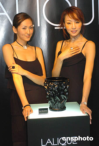 香港名模李嘉慧(左)、陳嘉容26日在香港中環(huán)演繹(LALIQUE)品牌水晶黑色系列。