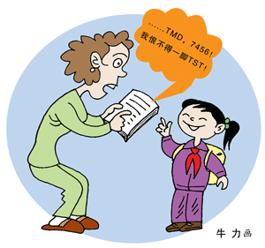 家住天津市和平區(qū)的許女士無意間發(fā)現(xiàn)女兒的日記中有這樣的文字:“……沒想到我最要好的朋友竟欺騙我,TMD(他媽的),7456(氣死我了),我恨不得一腳TST(踢死她)!痹S女士看后不知所云,直到女兒一番解釋她才明白過來。許女士無奈地對記者說:“這是什么話呀,日記本成了密碼本,根本看不明白!看來我和孩子之間已經(jīng)有了‘網(wǎng)絡(luò)溝’!