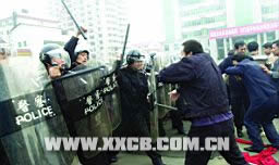 20余人聚集在某市市政府前“鬧事”,110民警迅速趕到現(xiàn)場(chǎng)設(shè)立警戒線,阻止“鬧事者”的前進(jìn)。但情緒激動(dòng)的“鬧事者”很快便沖破了第一道防線,開(kāi)始?xì)蛎窬=訄?bào)趕到的防暴大隊(duì)特警手持防暴盾牌進(jìn)行攔截,設(shè)置了第二道防線。為了迅速平息大規(guī)模的“騷亂事件”,上級(jí)命令使用催淚彈等對(duì)“鬧事人群”進(jìn)行驅(qū)散。幾顆催淚彈丟在地上,散出滾滾濃煙。當(dāng)特警采取防暴隊(duì)形圍捕了為首的“鬧事者”后,其余人便立即作鳥(niǎo)獸散去,“危機(jī)”終于化解。
