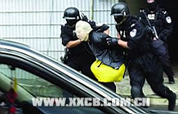 “我要裝滿油的汽車,把我送到安全地點(diǎn)!”“歹徒”用槍抵住“人質(zhì)”的頭,跑上三樓,從窗戶內(nèi)探出身子大叫:“不然我殺了他!”追捕小組一邊穩(wěn)定其情緒,一邊針對(duì)現(xiàn)場(chǎng)情況制定了強(qiáng)攻方案。3名特警從5樓貼墻緩緩而下,此時(shí)“歹徒”叫囂就要對(duì)“人質(zhì)”下手,中間的特警看準(zhǔn)時(shí)機(jī),開(kāi)槍擊斃了一名還在叫囂的“歹徒”。兩旁的特警乘機(jī)跳入房間,將另一名“歹徒”控制住。戰(zhàn)斗結(jié)束,“歹徒”一死一捕,“人質(zhì)”被安全救出。