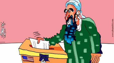 | 中新網(wǎng)11月1日電 10月29日晚,銷(xiāo)聲匿跡一年多的本拉登,在美國(guó)大選投票日來(lái)臨的前四天突然拋頭露面了。在半島電視臺(tái)播放了本拉登講話的錄像帶之后,分析家一致認(rèn)為拉登此次露面是為了給美國(guó)大選施加影響,試圖影響美國(guó)大選的最終結(jié)果。半島電視臺(tái)網(wǎng)站于今日發(fā)表了一幅漫畫(huà),在這幅漫畫(huà)當(dāng)中,本拉登被描繪成一個(gè)重量級(jí)選民,他的講話被戲稱作是在為美國(guó)總統(tǒng)大選提前投票。(章田)