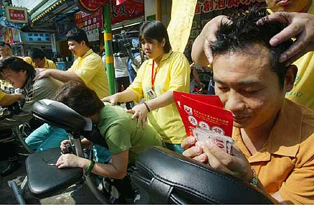 許多投注站都貼出“第100位樂(lè)透億萬(wàn)富翁”、“頭獎(jiǎng)獎(jiǎng)金上看6.5億元”的促銷海報(bào),還有投注站推出“買彩券送免費(fèi)按摩”的促銷活動(dòng)。