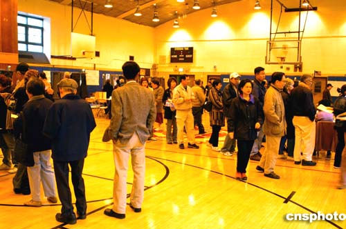 美東時間十一月二日清晨七點多鐘,在紐約市亞裔移民聚居區(qū)法拉盛的投票站內(nèi),已有五、六十位選民排隊等候投票。作者:龔文謨