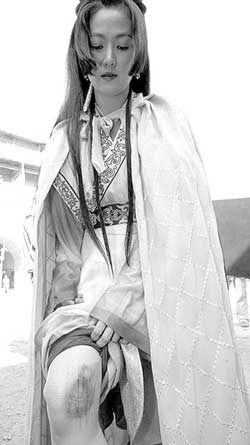 記者來到劇組探班時(shí),正趕上拍攝一場穆桂英在馬上戰(zhàn)群雄的戲,只見王思懿手持長槍躍躍欲試,剛要放馬撒開韁繩舉槍,馬突然驚了,一個(gè)加速,把王思懿從馬背上甩下來。劇組工作人員見此狀全都嚇呆了,因?yàn)橥跛架彩窍ドw先著地跌下來,已經(jīng)疼得暈過去。待將王思懿攙扶起來時(shí),她的腿部已根本不聽使喚,沒法走路,在導(dǎo)演、醫(yī)生等簡單處理后,記者才得知,原來思懿左腿膝部完全脫臼,轉(zhuǎn)了180度之后才扳回來。