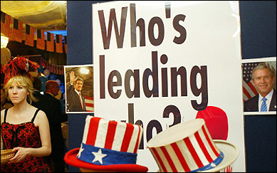 中新網(wǎng)11月3日電,據(jù)法新社報道 在英國倫敦達斯茅斯的一個大學宿舍里,正在舉行一個美國大選夜晚會。晚會上有一塊宣傳板,上面印有布什和克里兩位候選人的照片,還有一句口號:“誰領導誰?”(固山)