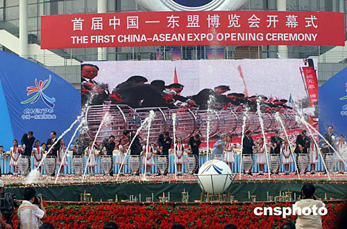 中國(guó)國(guó)務(wù)院副總理吳儀、柬埔寨首相洪森、老撾總理本南、緬甸總理梭溫、泰國(guó)副總理比尼、越南副總理范家謙等中國(guó)、東盟國(guó)家的政要,一起為中國(guó)東盟博覽會(huì)開(kāi)幕式剪彩,將來(lái)自中國(guó)和東盟各國(guó)江河湖海、象征著雙方合作源遠(yuǎn)流長(zhǎng)、生生不息的清純之水傾入瓶中。