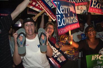 中新網(wǎng)11月3日電 據(jù)美聯(lián)社報(bào)道,選舉日當(dāng)夜,在佛羅里達(dá)州杰克遜維爾市的一個(gè)縣級選舉官員辦公室前,支持布什和克里的人在相互叫喊著。凱里-約翰遜,布什總統(tǒng)的支持者,正在鏡頭前揮舞著一雙涼鞋,上面印有布什的照片。(春風(fēng))