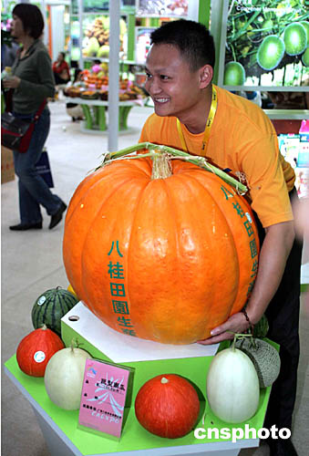 十一月三日到六日在廣西南寧開(kāi)幕的首屆中國(guó)—東盟博覽會(huì)上,一名參觀者在廣西農(nóng)業(yè)展廳里的巨型南瓜前留影。本屆博覽會(huì)參展商品涉及機(jī)械、家電、電子信息、汽車(chē)及配件、五金建材、農(nóng)產(chǎn)品、醫(yī)藥化工、輕工等十一個(gè)行業(yè)共二百多類(lèi)產(chǎn)品。中新社記者:武仲林