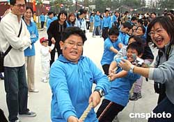 臺(tái)商子女黃文翰與同學(xué)們參加拔河比賽,家長在一邊加油。作者:潘索菲