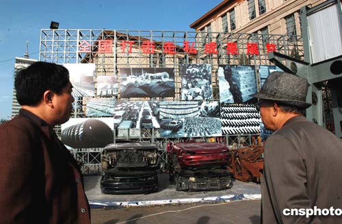 走私大鱷賴(lài)昌星座駕——奔馳S600防彈車(chē),由兩名威嚴(yán)的武警戰(zhàn)士監(jiān)護(hù)。據(jù)悉,該防彈車(chē)重量遠(yuǎn)超普通奔馳車(chē),防彈玻璃為雙層,有三、四厘米厚,輪胎也是防彈的。它將和其它走私車(chē)一同在展覽結(jié)束當(dāng)天進(jìn)行拍賣(mài)。中新社記者:王麗南