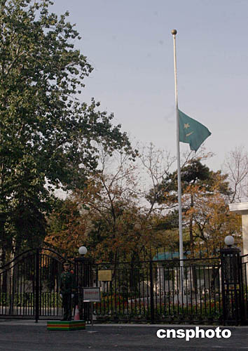 十一月十一日下午,北京的毛里塔尼亞伊斯蘭共和國駐華使館降下半旗,向當天去世的巴勒斯坦民族權力機構主席阿拉法特致哀。中新社記者:史利