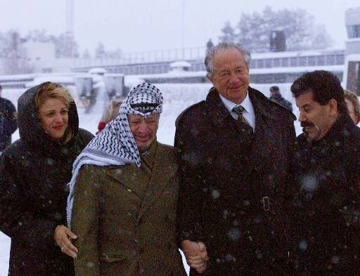 中新網(wǎng)11月12日電 1998年12月5日,阿拉法特訪問瑞典,與瑞典前首相安德森會面,左一為阿拉法特的妻子蘇哈。(春風(fēng))