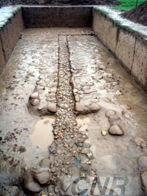 記者今天在考古現(xiàn)場看到,大型夯土建筑臺(tái)基南北寬四十五米,東西長兩百五十米,高九米,距地表七米,有縱橫交錯(cuò)的管道,證明此曾為一處大型宮殿。北面是宮殿的后花園,有一條由大小鵝卵石砌成的石渠。石渠東西長八點(diǎn)九米,渠西向北拐延伸四點(diǎn)九米,渠東向南拐延伸十七點(diǎn)四米,現(xiàn)存共長三十一點(diǎn)二米。渠心較窄,寬零點(diǎn)四米,深十二到十五公分,渠的底部鋪著一層比較大的卵石,渠壁也鑲嵌著一層卵石,排列整齊,渠壁兩邊各鋪著三排卵石,以“品”字型排列,制作非常精致,打磨光潔。
