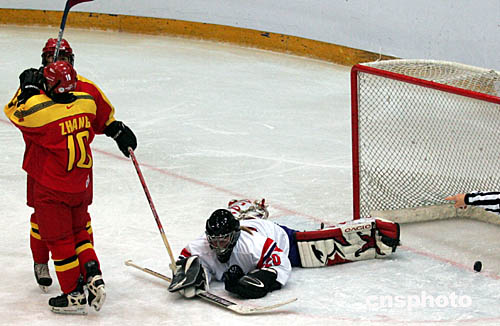 十一月十二日,在北京首體綜合館舉行的二零零四年女子冰球奧運會資格賽上,中國隊(紅)以十比零大勝挪威,取得兩連勝。中新社記者:武仲林