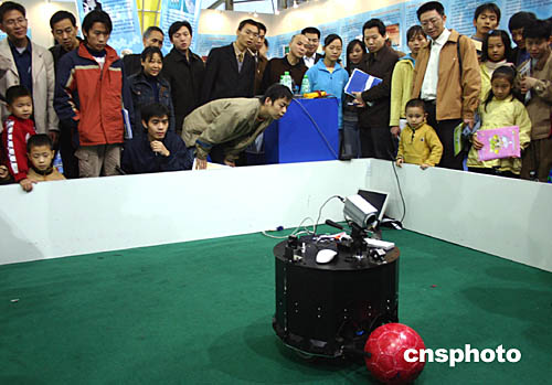 | 第六屆重慶高新技術(shù)交易會(huì)暨第二屆中國(guó)國(guó)際軍轉(zhuǎn)民科技博覽會(huì)十三日在重慶開(kāi)幕,共展出近二千五百項(xiàng)科技項(xiàng)目。圖為“足球機(jī)器人”正在臨時(shí)圍成的球場(chǎng)里“踢”足球,吸引了眾多參觀者的目光。作者:郭晉嘉