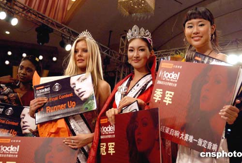 二零零四星際世界模特大賽全球總決賽,十一月十四日晚在廣東珠海舉行,五十位來(lái)自全球四十一個(gè)國(guó)家的專(zhuān)業(yè)模特參加角逐。泰國(guó)選手(中)獲得冠軍,烏克蘭選手(左)獲得亞軍,中國(guó)王琤(右)獲得季軍。作者:劉衛(wèi)勇