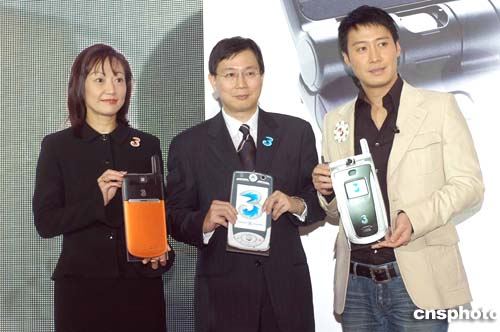 歌星黎明11月17日在香港出席和記電訊新型號3G視像手機(jī)推介記者會,和記電訊行政總裁呂博聞及3香港董事總經(jīng)理李家慧與及歌星黎明于記者會上,共同推介三大型號3G視像手機(jī)將強勢登場。作者:鄧慶樂