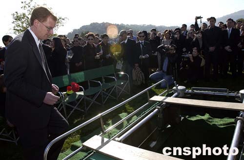 今天的安葬儀式有三百余人出席,中國駐舊金山副總領(lǐng)事邱學(xué)軍專程前往參加并宣讀了彭克玉總領(lǐng)事的唁電,向張純?nèi)绲挠H人表示慰問。彭克玉說,雖未與張純?nèi)缰\面,但早已得知她的作品和事跡。她以正義、勇敢、執(zhí)著、求實的精神揭露了侵華日軍在中國的暴行,還歷史以真實,讓世界了解了南京大屠殺的真相。彭克玉還贊揚張純?nèi)鐬槿A裔的權(quán)益、為增進美國人民對華裔的了解作出了貢獻,是人們永遠懷念和尊敬的偉大女性。張純?nèi)鐑簳r的伙伴、大學(xué)的好友等也分別回憶了往日與張純?nèi)绲某ο嗵帯?object align="left" classid="clsid:D27CDB6E-AE6D-11cf-96B8-444553540000" codebase="http:///pub/shockwave/cabs/flash/swflash.cab#version=5,0,0,0" height="240" width="320">