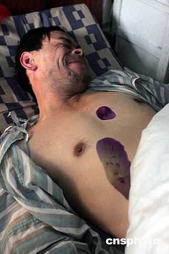十一月二十二日,在“11.20”河北省邢臺(tái)市沙河礦難中受傷的陜西籍礦工李國(guó)友在醫(yī)院接受治療。礦難發(fā)生后他在礦下堅(jiān)持了二十多個(gè)小時(shí),并協(xié)助挽救了十七名礦工的生命。