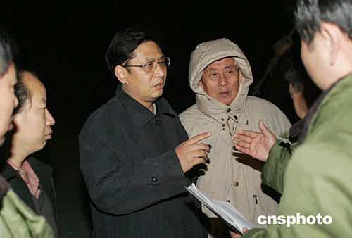 | 二零零四年十一月二十二日晚,中國(guó)國(guó)家安全生產(chǎn)監(jiān)督管理局副局長(zhǎng)孫華山(左三)在“11.20”河北沙河礦難事故現(xiàn)場(chǎng)指揮救援。截止二零零四年十一月二十二日十九點(diǎn)三十分,“11.20”河北沙河礦難遇難礦工已達(dá)五十七人,另有三人下落不明。中新社記者:武仲林